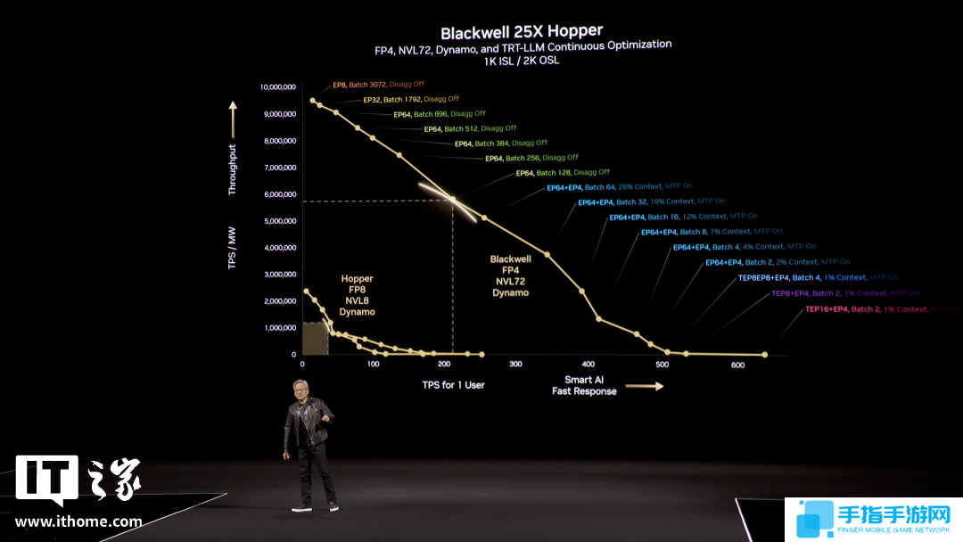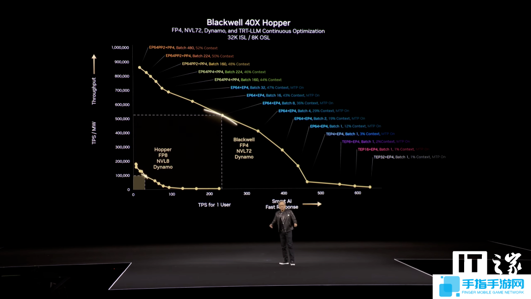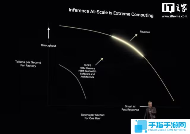 黄仁勋展示了一张关于推理的图表,X 轴显示用户每秒的 Token 数,Y 轴显示工厂每秒的 Token 数。