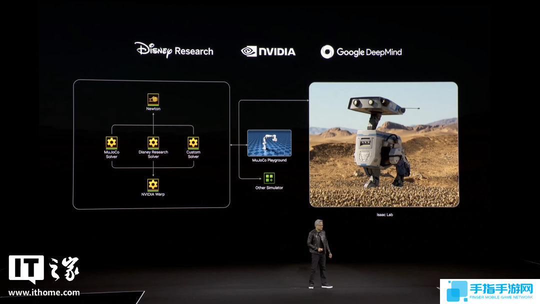 老黄首先展示了与迪士尼和谷歌 Deepmind 团队合作打造的物理引擎 Newton,并把小机器人 Blue 请到了台上进行互动。