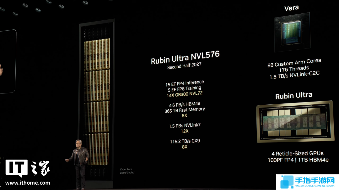 而更强的 Rubin Ultra NVL576 将于 2027 年下半年推出,拥有 365TB 带宽 4.6PB/s 的 HBM4e 内存,带来 14 倍于GB300 NVL72 的性能。