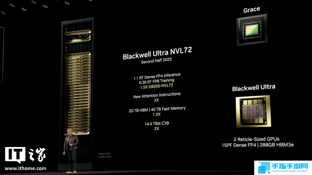 随后,老黄正式发布了之前传言已久的“超大杯”GB300 芯片,并将其命名为 Blackwell Ultra,单颗便配备了 288GB 的 HBM3e 内存,拥有 15PF 的稠密 FP4 算力。