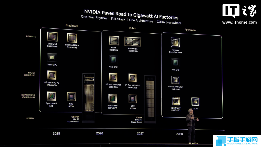 接下来,黄仁勋公布了继 Hopper、Blackwell 之后的下一代 AI 芯片 Rubin。
