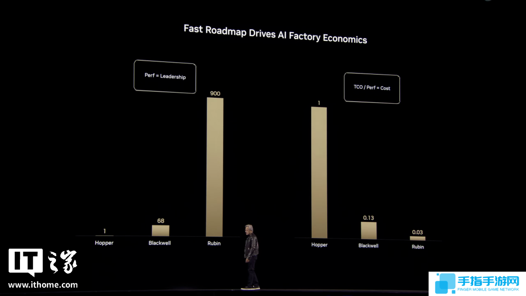 Rubin 的性能可达 Hopper 的 900 倍,而 Blackwell 是 Hopper 的 68 倍。