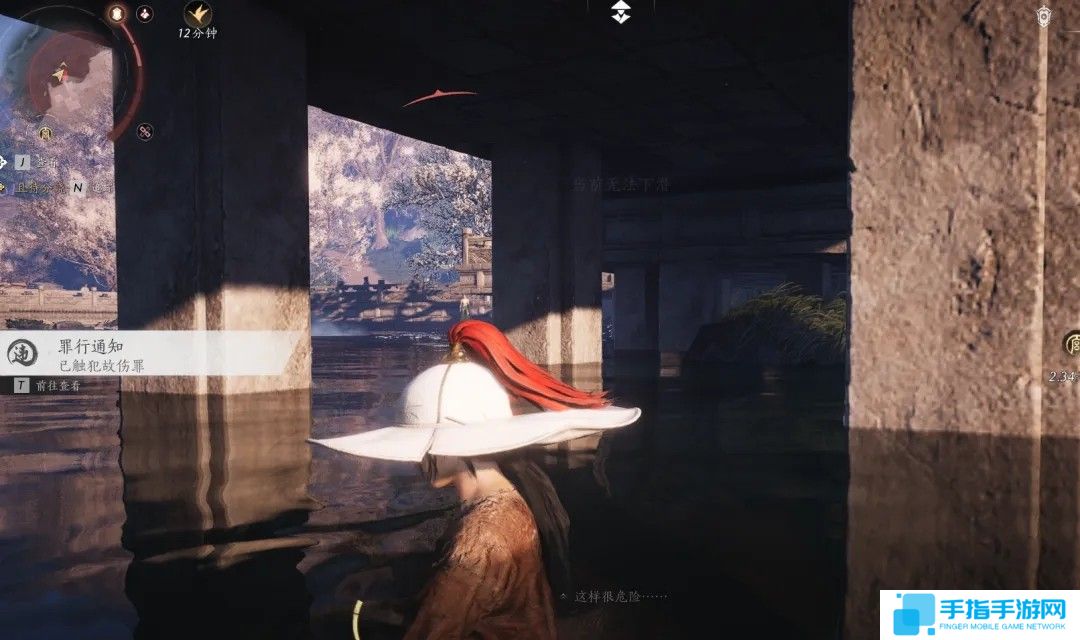 2、然后就是开始到岸边用太极把一个NPC丢到水里处决。这个时候NPC目击者已经报官了,触发通缉后,捕快一来。就近可以躲到临江驿桥下,逃脱追捕。
