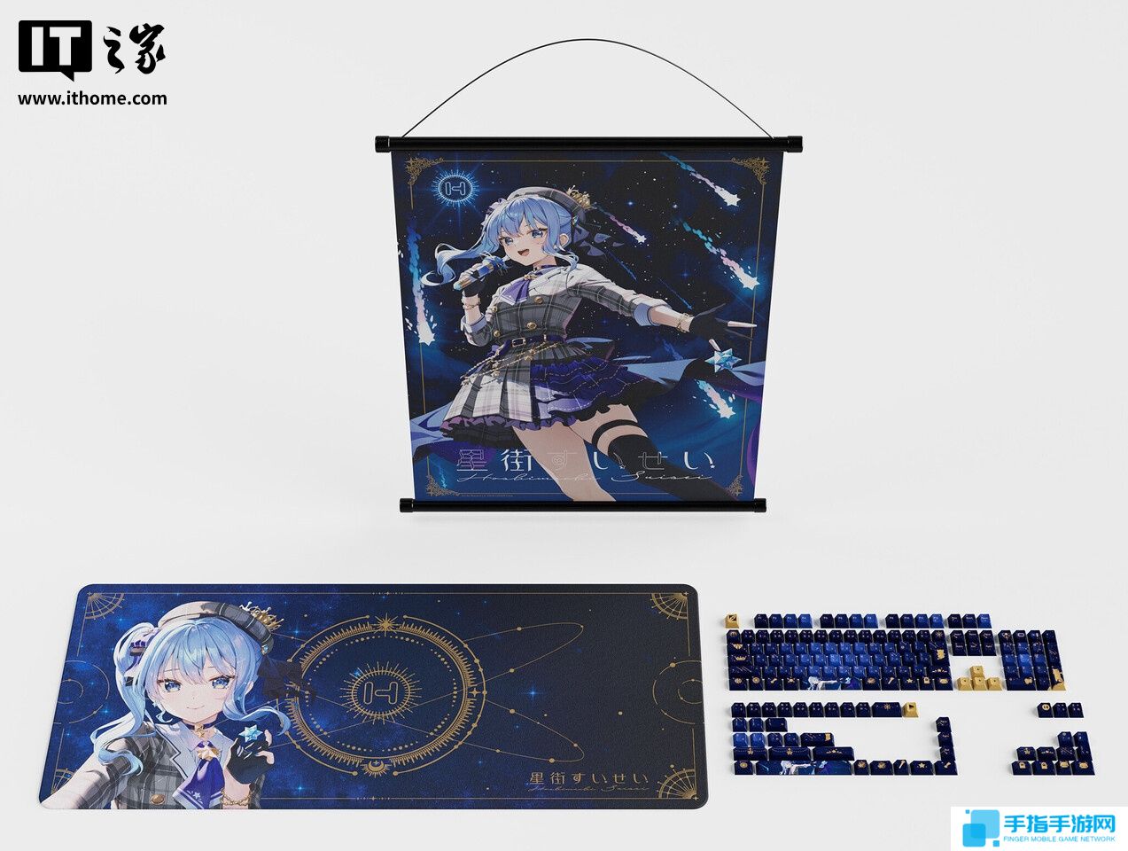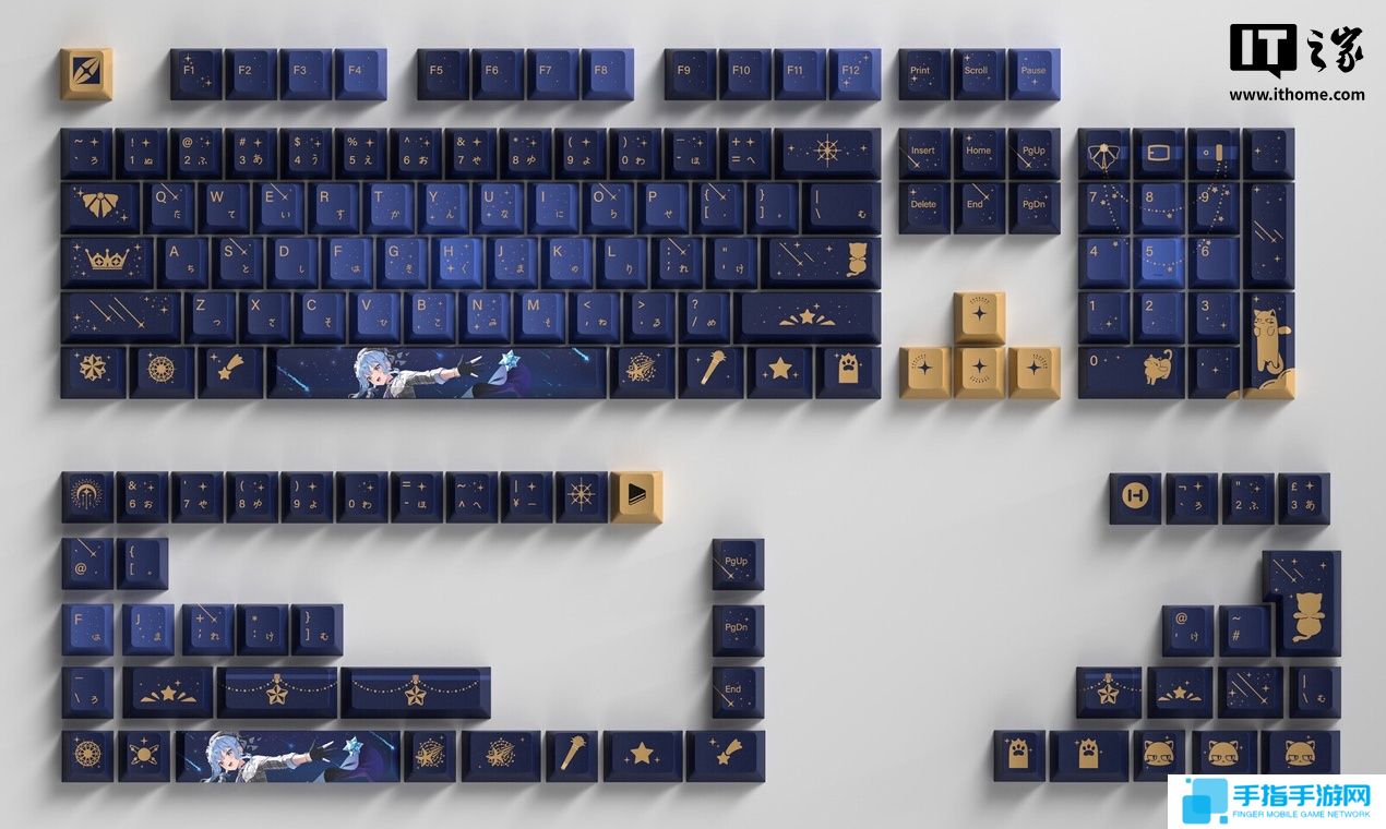 键帽兼容 ANSI / ISO / JIS 标准键盘,含 153 枚键帽,以蓝金渐变色调复刻星街彗星风格。键帽上的文字采用角色标志性设计,同色系桌垫也采用标志性设计。