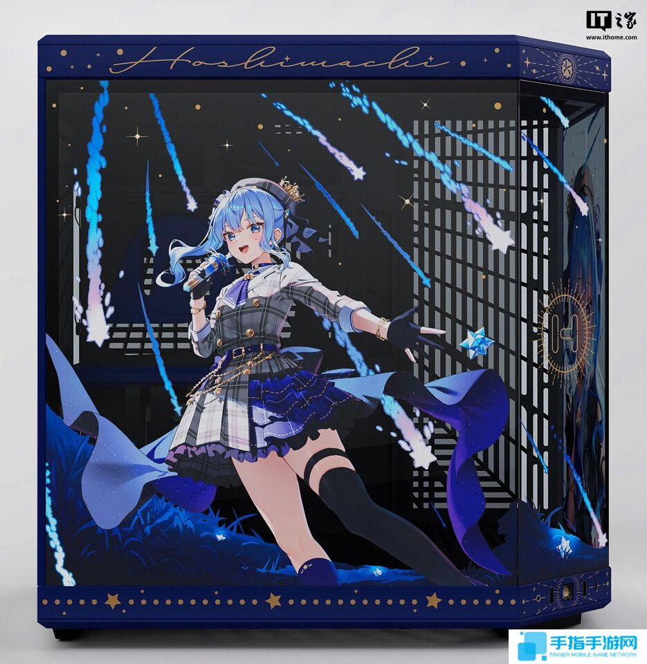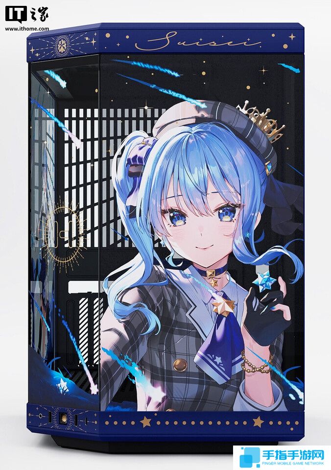 根据 HYTE 官网介绍,该机箱整体采用午夜蓝与鎏金渐变配色设计,呼应角色形象,右侧版及电源键等部位融入星街彗星专属符号;机箱正侧面饰有画师 Rosuuri 创作的星街彗星定制图片。机箱外部外用全景侧透玻璃设计,机箱内部采用隐藏线束设计,减少视觉干扰。官方同时还附赠显卡竖装延长线,方便玩家展示显卡 RGB 灯效,首发限定版还将附赠星街彗星挂毯。