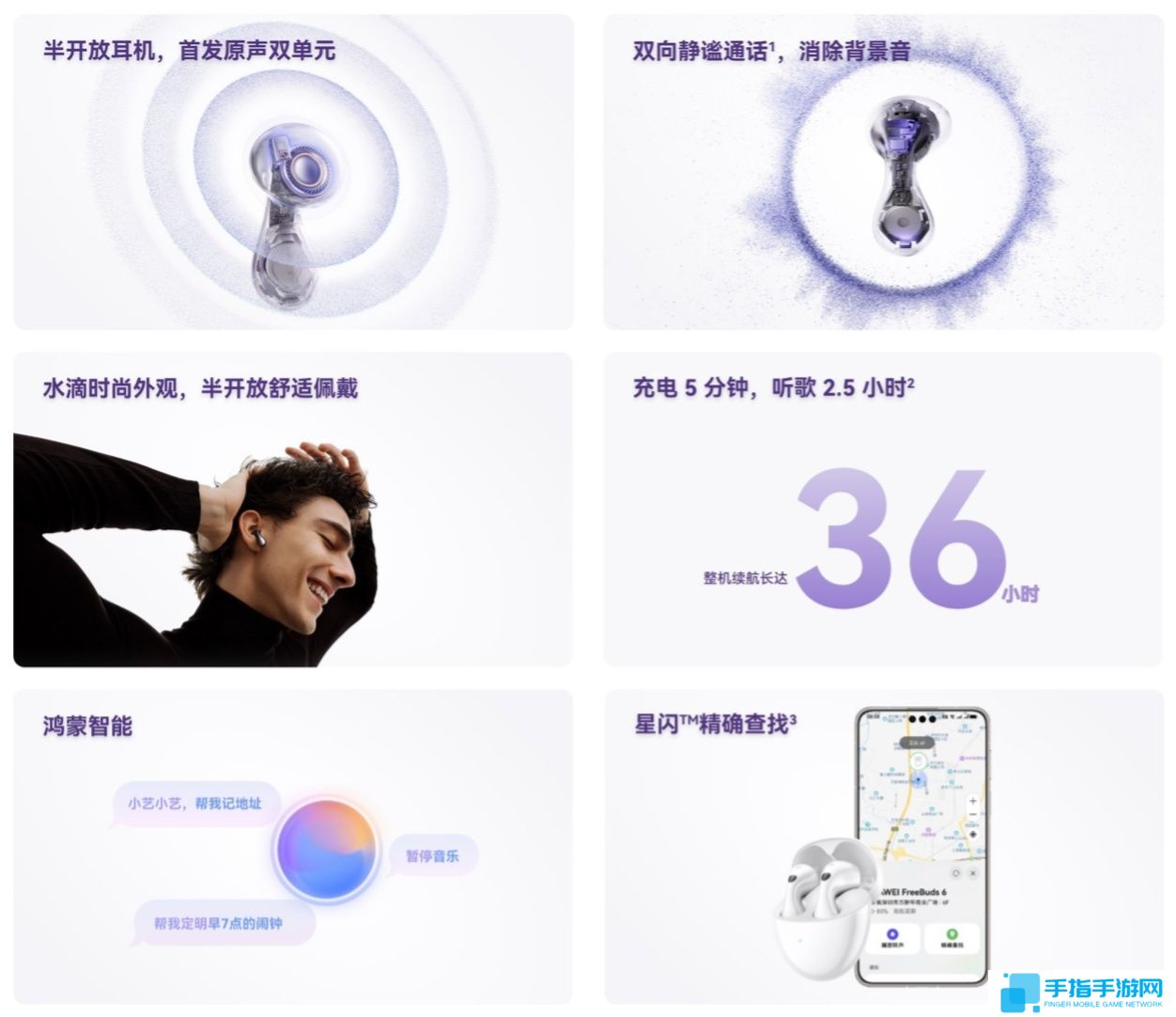 据介绍,华为 FreeBuds 6 悦彰耳机拥有极光紫、星空黑、天际白三款配色,采用水滴外观 + 半开放设计、支持双向静谧通话、鸿蒙智能、头部追踪空间音频、星闪精准查找等功能。