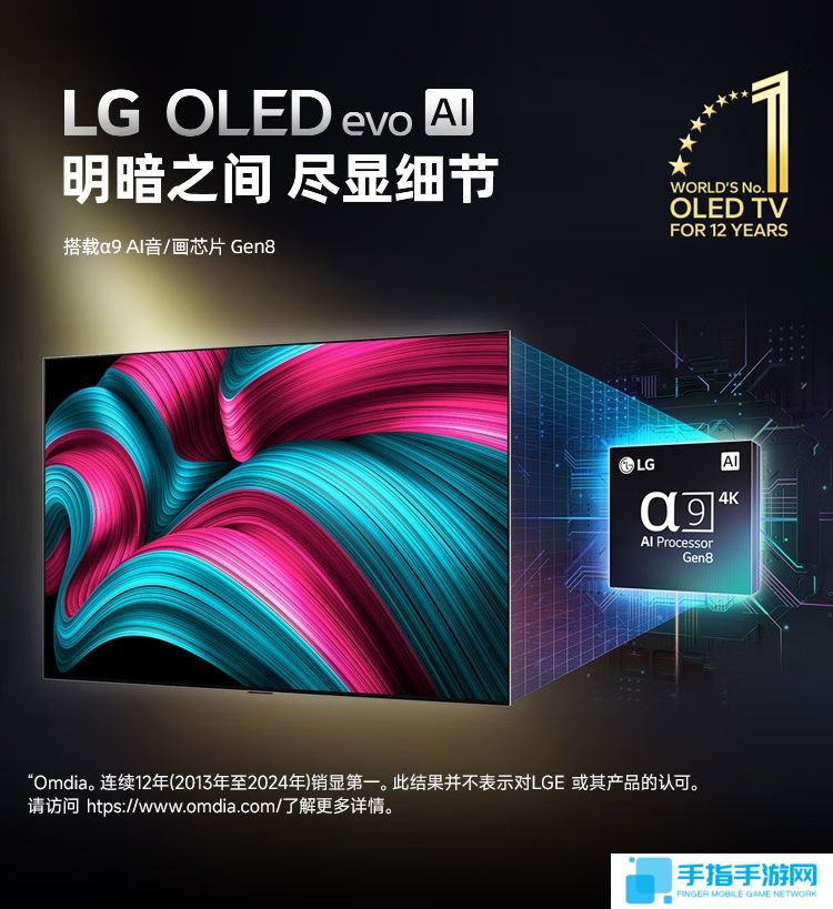 这款电视搭载了 LG α9 AI 音画芯片 Gen8,可实现 1.7 倍 AI 性能提升、2.1 倍图像改善、1.7 倍处理速度提升。